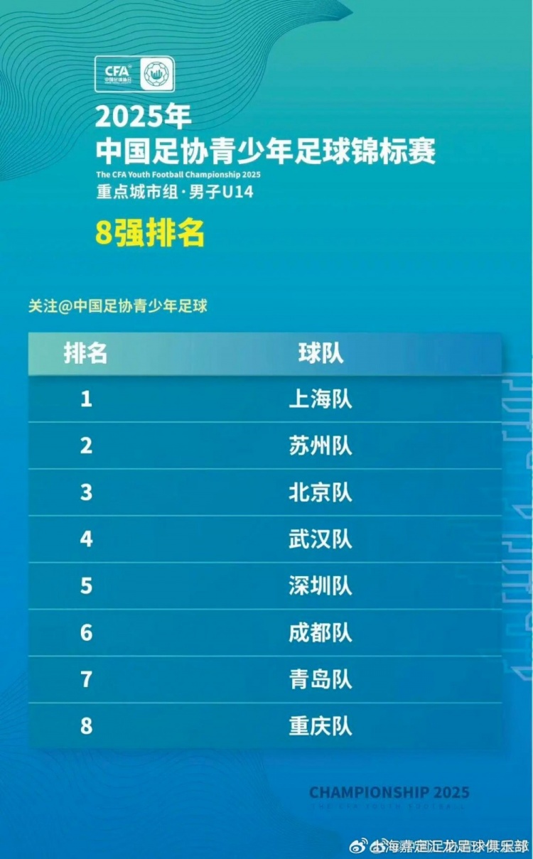 10月18日,2025年中国足协青少年足球锦标赛重点城市男子U14组第三阶段在武汉赛区落幕,上海U14以3-0的比分战胜苏州队夺冠,嘉定汇龙青训球员周俊怡、周墨随队出战并斩获多个个人奖项。