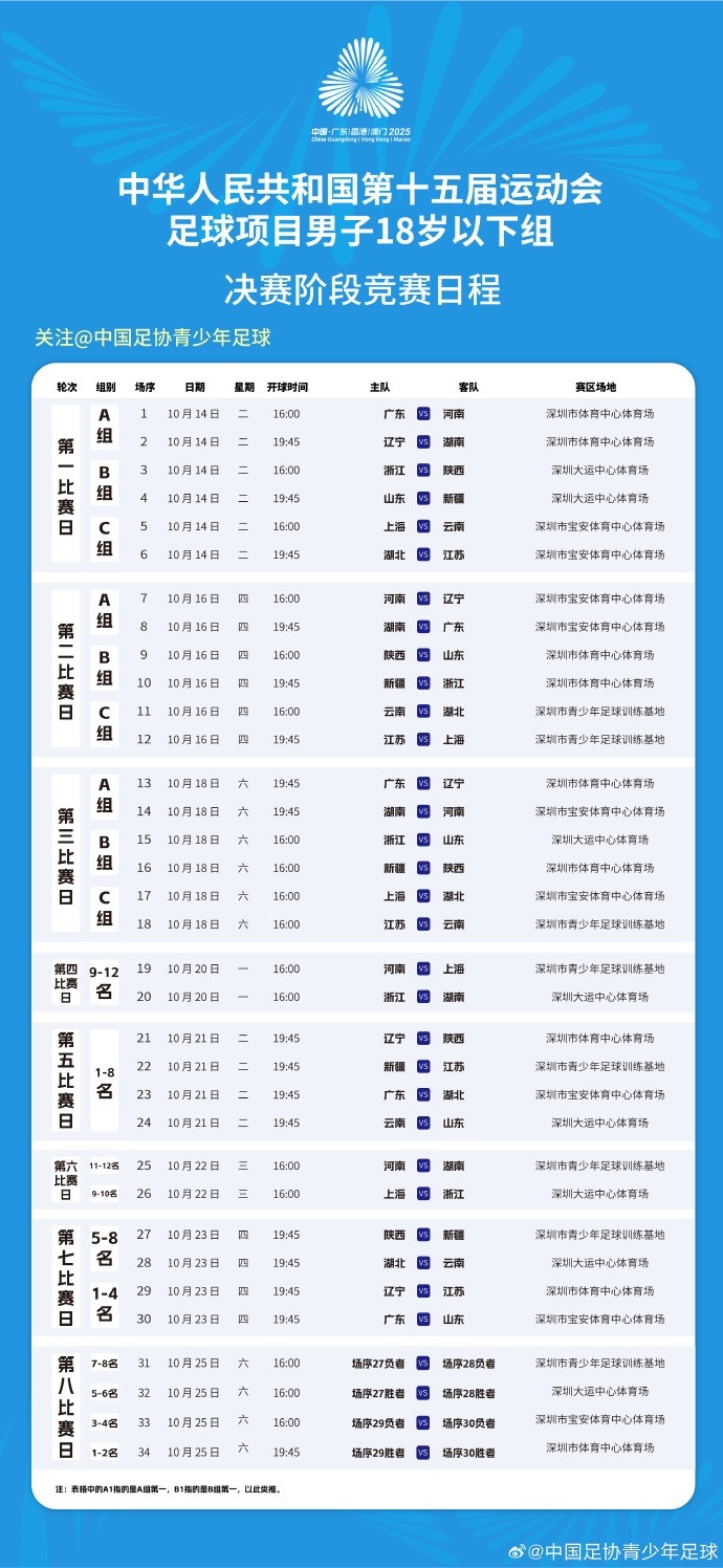 全运会U18男足决赛阶段第六比赛日和第七比赛日对阵表
